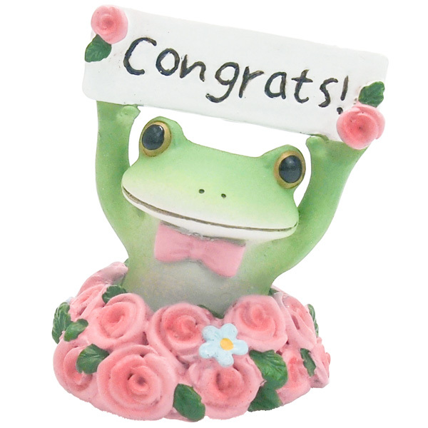 バラに囲まれて「Congrats(おめでとう)」看板を掲げたカエル。